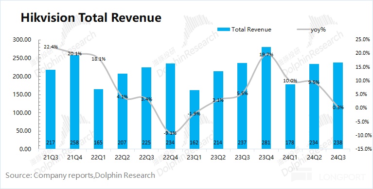海康威视在 2024 年第三季度实现营收 234 亿元,同比上升 0.3%。公司业务线众多,但本季度各业务增长情况有明显 “温差”。