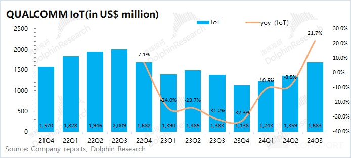 高通的 IoT 业务在 2024 财年第四季度(即 24Q3)实现营收 16.83 亿美元,同比增长 21.7%,好于市场预期(15.55 亿美元)。IoT 业务在经历 6 个季度的下滑后,本季度再次迎来明显增长。