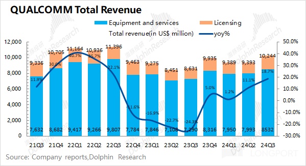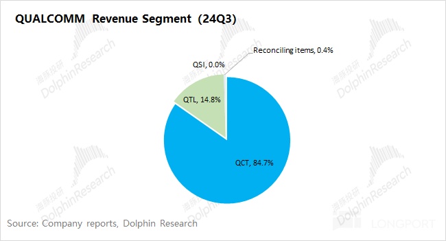 高通的 IoT 业务主要包括消费类电子产品、边缘网络类和工业类产品。而从公司财报看,公司本季度得益于 XR、AI PC 等方面的新品带动和产业链补库存。在近期推出的新 Quest 3S 设备搭载了 Snapdragon® XR2 Gen 2 芯片;戴尔、惠普、联想、三星、宏碁和华硕在内的领先 OEM 都有用公司 Snapdragon® X Plus 8 核平台提供支持的设备。随着 AI PC 等需求的增加,IoT 业务本季度重回增长。