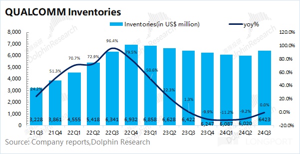 高通在 2024 财年第四季度(即 24Q3)的存货有 64.2 亿美元,同比持平。海豚君认为公司的存货端已经明显改善,而环比层面的再次回升,主要是因公司对下季度新品已经开始备货,也表明公司对自身经营面的信心。而在存货情况改善的影响下,也推动着公司毛利率的回升。