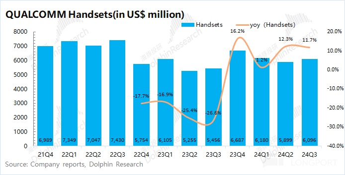 高通的手机业务在 2024 财年第四季度(即 24Q3)实现营收 60.96 亿美元,同比增长 11.7%,好于市场预期(60.44 亿美元)。季度增长主要来自于中国安卓厂商(米 OV)的需求回升,但仍处于相对低位。
