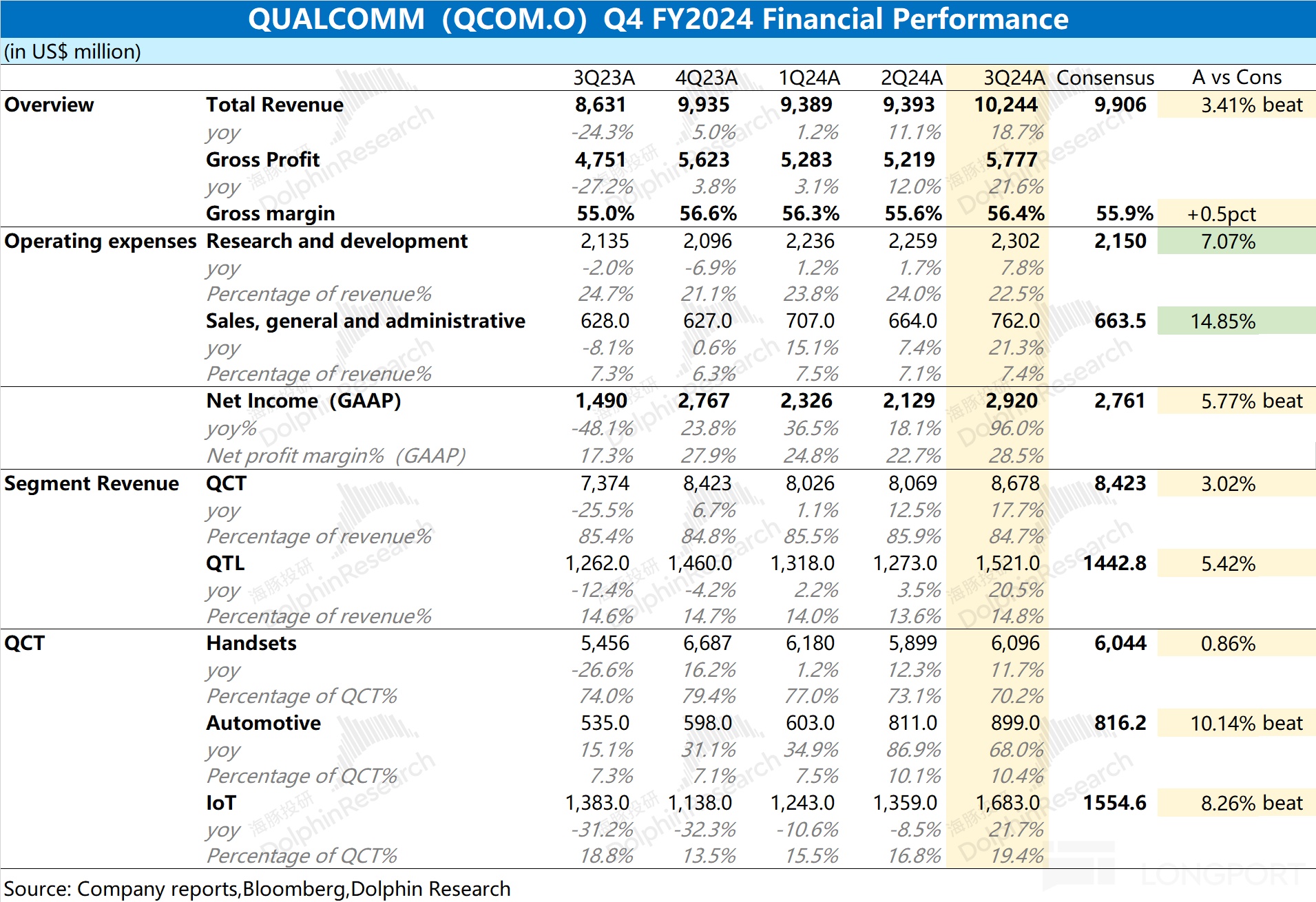 1、整体业绩:收入&利润,双双超预期。高通在 2024 财年第四季度(即 24Q3)实现营收 102.4 亿美元,同比增长 18.7%,好于市场预期(99.6 亿美元)。公司本季收入增速继续提升,主要受益于手机、汽车及 IoT 等业务的全面回暖;公司在本季度实现净利润 29.2 亿美元,同比增长 96%,好于市场预期(27.6 亿美元),同比增长主要来自于收入端和毛利率的双双提升。