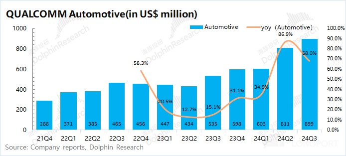 高通的汽车业务在 2024 财年第四季度(即 24Q3)实现营收 8.99 亿美元,同比增长 68%,好于市场预期(8.16 亿美元)。汽车业务是公司主要业务中增速最快的一项,增长主要来自于搭载公司骁龙数字座舱及车联网产品的新车需求增加。公司预期下季度汽车业务仍将有 50% 的增长。