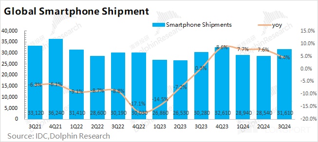 从行业数据看,2024 年三季度全球智能手机出货量为 3.16 亿台,同比增长 4.4%。虽然手机市场出货量的整体增速相对有所回落,但公司主要客户在本季度表现还是不错的。尤其是 VIVO 在经历产业链去库存等影响后,本季度手机出货量同比增长 22.7%。公司相关客户的回暖表现,直接推动公司手机业务的增长。