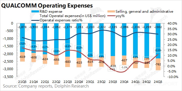 高通在 2024 财年第四季度(即 24Q3)的经营费用为 30.64 亿美元,同比增长 10.9%,本季度销售费用及研发费用都有不同程度的增长。