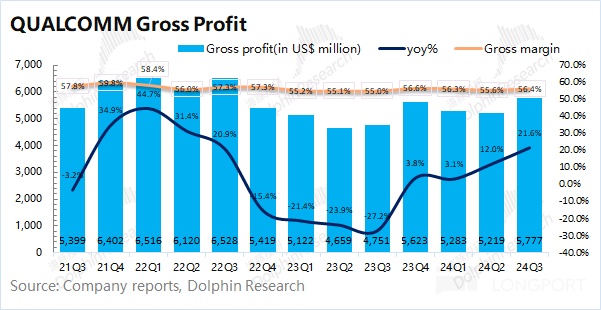 高通在 2024 财年第四季度(即 24Q3)实现毛利 57.77 亿美元,同比增长 21.6%。毛利端同比增速快于收入端,主要是因为毛利率同比有所回升。