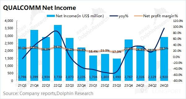 高通在 2024 财年第四季度(即 24Q3)实现净利润 29.2 亿美元,同比增长 96%,好于市场预期(27.6 亿美元)。本季度净利率 28.5%,盈利能力再次回升。