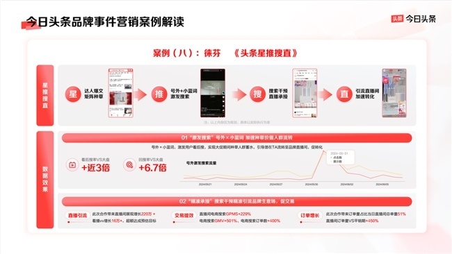 个护小家电品牌徕芬,在今日头条巧用「头条星推搜直」,打通达人爆文矩阵种草、号外 + 小蓝词激发搜索、搜索干预直播承接、引流直播间加速转化全链路,在产品从种草到交易全过程中,构建出品牌专属注意力真空场域。