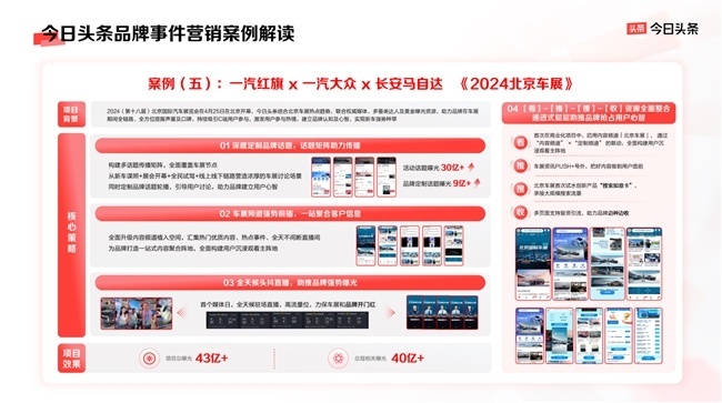 围绕北京车展这一行业盛事,今日头条联合权威媒体、多垂类达人及黄金曝光资源,助力一汽红旗、一汽大众、长安马自达三大品牌,构建多话题传播矩阵,共登上十余个话题热榜,总榜最高第四,汽车榜包揽第一第二,从新车谍照到展会开幕、再到全民试驾,线上线下多链路全面覆盖车展节点,营造出浓厚的车展讨论氛围场景。借势北京车展热点,项目总曝光超 43 亿,品牌定制话题曝光超 9 亿。今日头条协助三家车企在这一热点事件下充分抢占用户心智。
