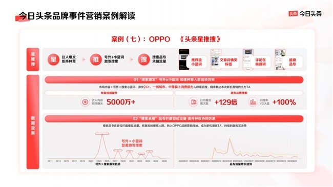 如 OPPO 新机上线。今日头条配合品牌布局头条星推搜,针对性触达 24+、一线城市、中等偏上消费能力人群,激发其看后搜动作。通过达人爆文矩阵种草、号外 + 小蓝词激发搜索、搜索品专承接流量,层层递进,协助 OPPO 新机获得 5000 万 + 曝光,激发日均看后搜次数增长 129 倍、回搜率对比大盘增加 100%。今日头条帮助品牌在新品上市期精准触达高潜用户人群,抢占先机。