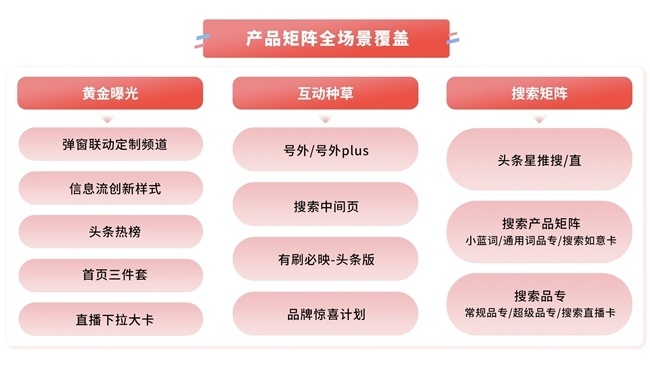 除了营销方法的突破,还有营销产品的加持。今日头条多样化的商业产品矩阵,为品牌组合营销玩法提供更多可能性。黄金曝光、互动种草、流量守卫、搜索品专等多种商业产品,可以协助品牌根据当前营销诉求具体组合,强针对性用户沟通,构建出品牌专属的注意力真空场域。