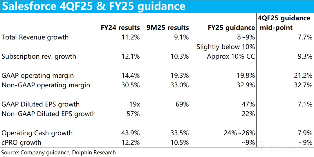 ② 从趋势的角度,3Q 收入增速(无论是整体还是核心的订阅收入)较上季度继续略微放缓 0.1pct,表明在Agentforce 之外 Salesforce 现有业务的增长趋势是在继续向下的。