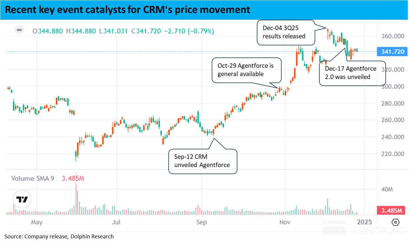小结来看,3Q 当季业绩除了有所提速的 cPRO 增长外并无显著亮点,对 4Q 的指引更是在全部关键指标上都边际变差,看起来并不值得业绩后 10% 的涨幅。且近期 Salesforce 股价突破的节点,都于 Agentforce 的推出和上线的节点精准的一致。经过上述简要复盘,海豚投研认为,近期 Salesforce 股价的强劲表现,与近期的业绩基本面并无多大关联,主要是由于市场对 Agentforce--“AI agent” 概念下最早的商业实例的前景的乐观预期和提前反映。