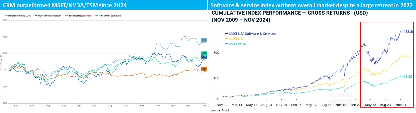 但资本市场上,以微软、英伟达、台积电为代表的 AI 产业链上游,即硬件芯片和云计算基础设施自 24 年下半年以来,大体上是震荡走平,并未随着 AI 技术的不断演进继续创新高。反而 AI 产业链的下游,即软件或 SaaS 服务商则涨幅不俗。由下图可见,最大的 SaaS 服务商之一 Salesforce 在 2H24 的累计涨幅超过 30%,明显跑赢上述三家上游龙头不足 20% 的累计涨幅。更广的视角下,MSCI Software & Service 指数自 22 年低点的上涨斜率也大幅跑赢 MSCI 全美指数。市场内对 2025 年 AI 下游软件端可能会跑赢中上游硬件和基础设施的声音并不鲜见。