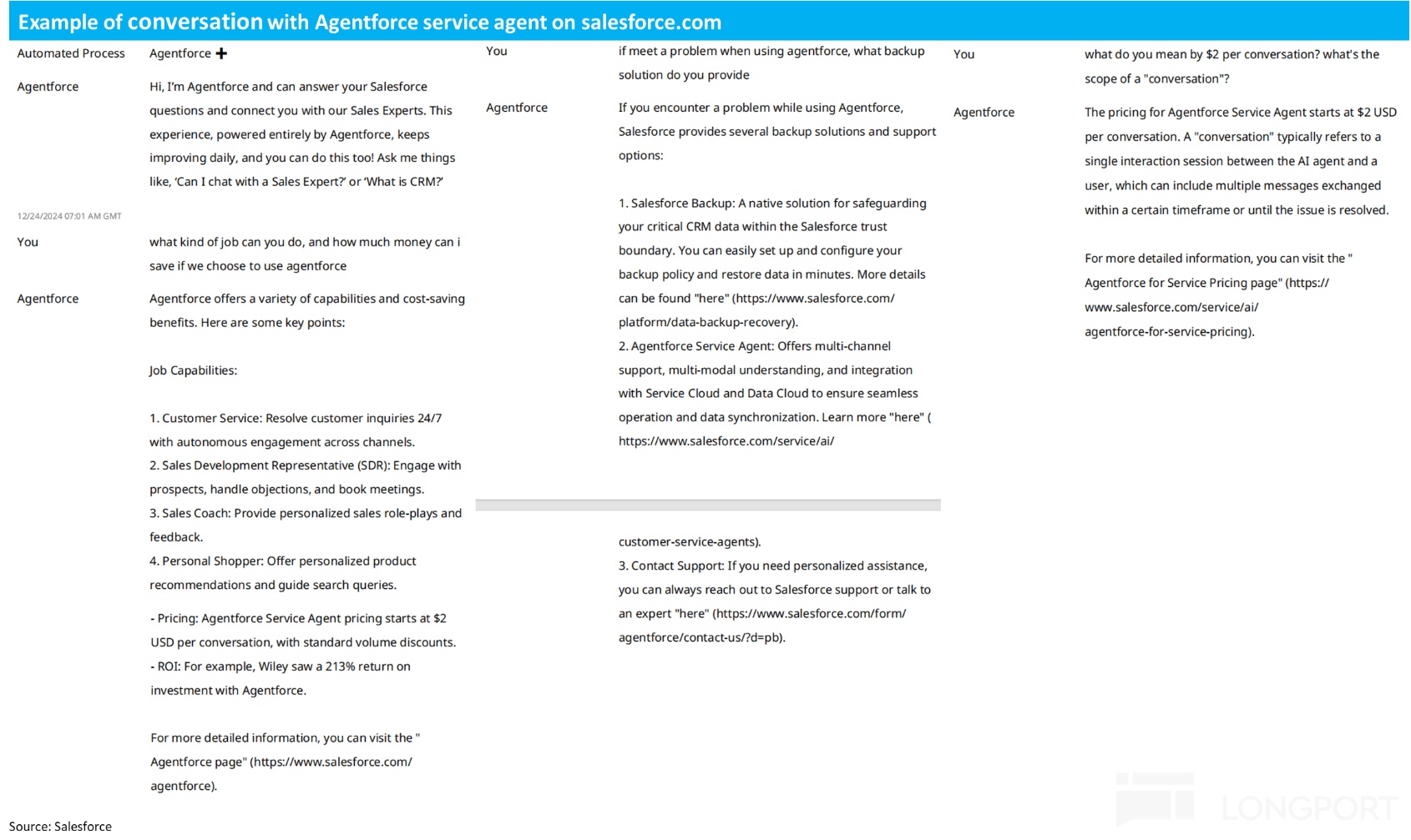 以目前 Agentforce 落地最顺畅的 service agent 为例,目前 Salesforce 对 service agent 的定价是$2 per conversation(实际有可能会提供一定折扣)。相比之下,据行业调研人工客服平均应答一次问询(conversation)的成本大约在$2.7~$5.6 之间。作为交叉验证,我们自行做了测算:① 据查询,美国平均一个客服员工的年工资大约在$35,000~$70,000 左右;② 按单个员工平均每周工作时间在 40~50 小时左右(有可能会更高);③ 假设平均每次沟通花费时间为 10 分钟(包括空闲等待时间)。按上述假设,海豚投研自行测算的人工客服单次沟通成本大约在$2.8~$4.5 左右,和市场调研的数据接近。