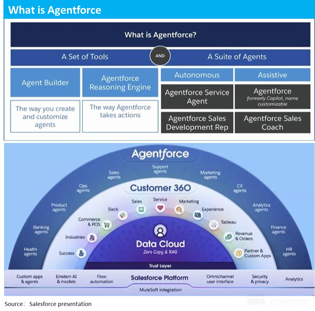 在此背景下,海豚投研此次就以 Salesforce(NYSE:Salesforce)为研究对象和切入口,一方面尝试探究市场看多软件端背后的原因、逻辑是什么?其中基本可以明确的原因之一,就是前文提及的 “AI agent” 概念下的 Agentforce。因此,Agentforce 到底是什么,以及 Agentforce 会给行业和 Salesforce 带来哪些影响,也会是本文尝试探讨的内容。