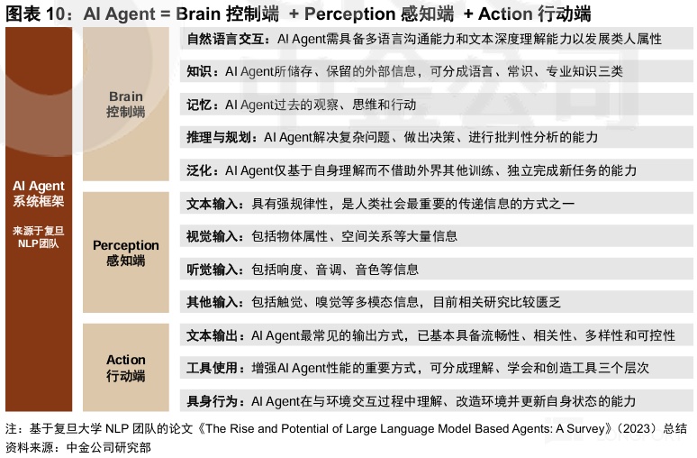 ① 分析决策模块(大脑):如各类基于 LLM 的 AI 模型。以海豚投研的认知,当前的各类大模型都已具备成熟的自然语言交互能力和一定的推理和分析能力。但距离能进行长链路且能保证较高 “正确性” 的推理、分析和判断能力,以我们的认知,目前的 AI 大模型应当还需要一定时间的发展