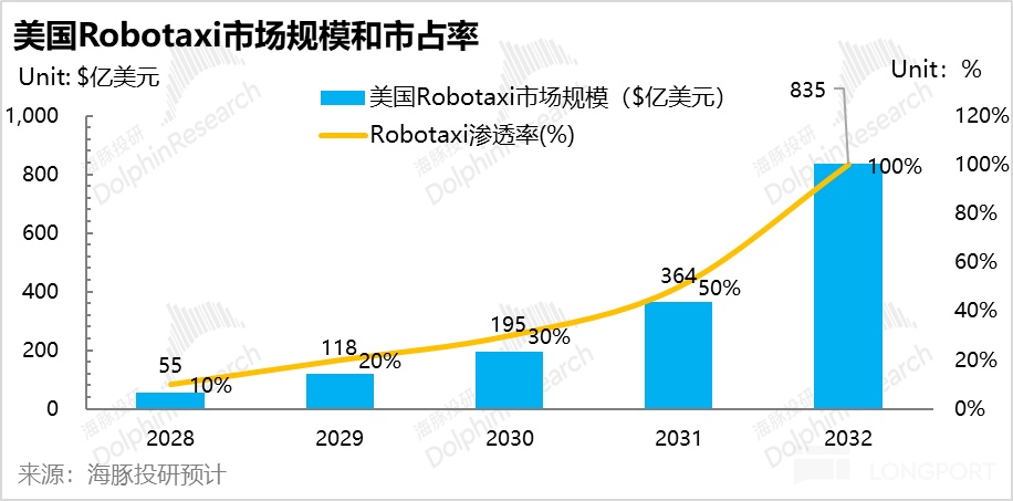 而在Robotaxi的布局上,由于美国目前有能力走端到端路线的玩家只有特斯拉,所以海豚君假设特斯拉占据Robotaxi的龙头地位,市占率能达到美国Robotaxi市场的80%(目前Uber美国市场市占率大约75%上下)。