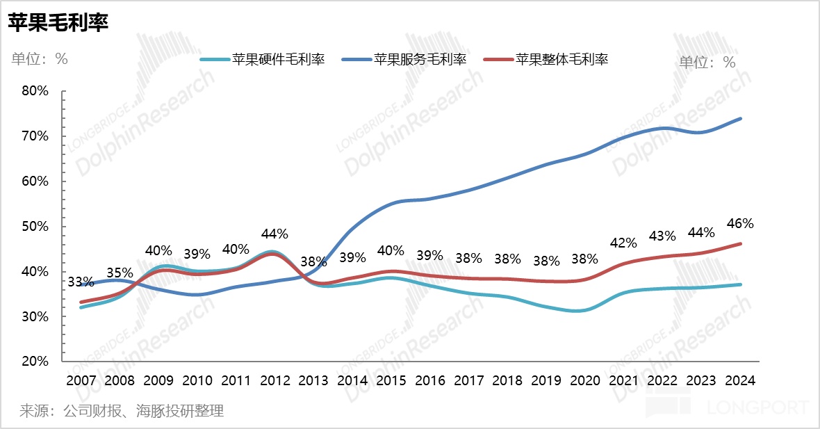 苹果服务业务高毛利将苹果整体毛利率2007年从33%拉升到2024年46%。