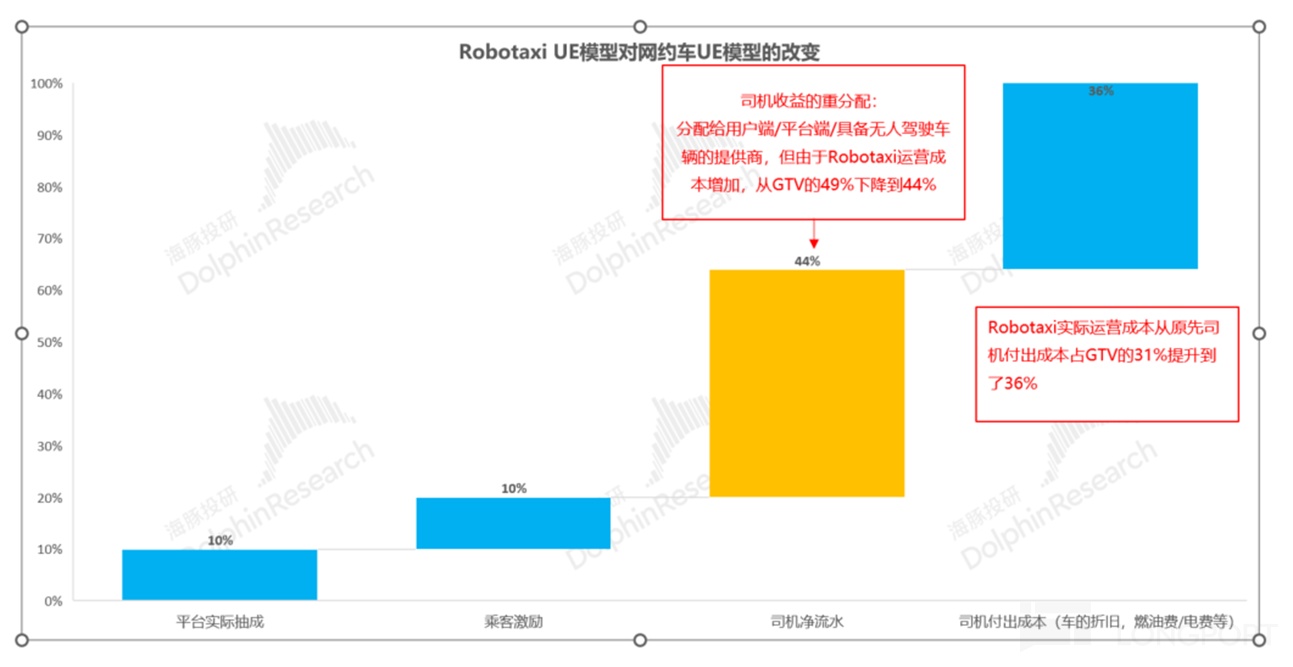 实际的Robotaxi的运营成本率还略高于司机成本率(Robotaxi 自运营方成本率36% vs 网约车司机成本率31%),Robotaxi相比网约车能节省的司机收益的重分配部分从GTV的49%下降到了44%。