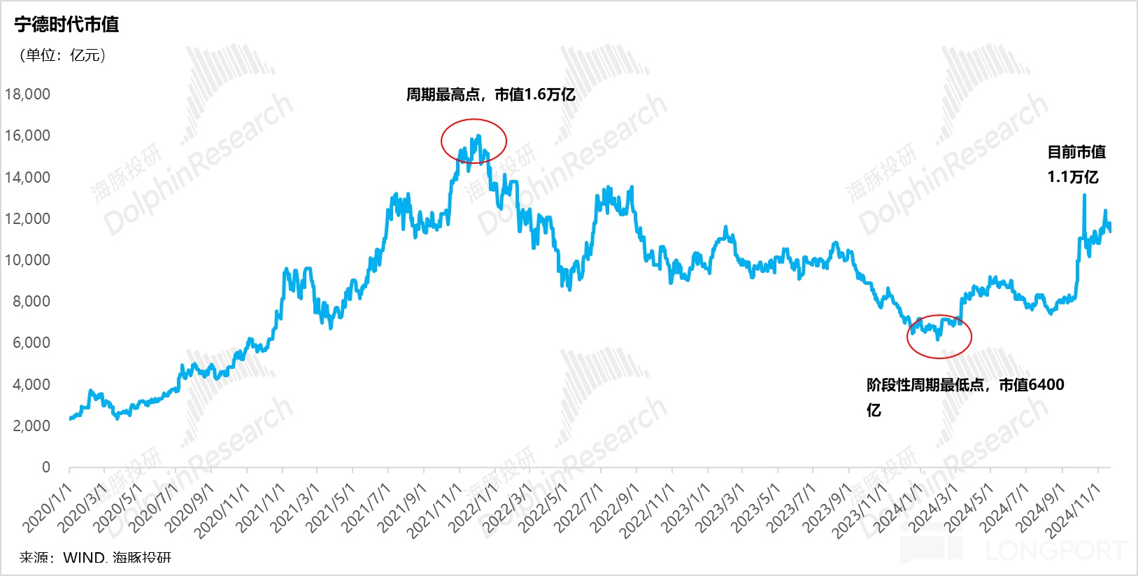 从宁王的历史股价复盘来看,宁王的市值从2021年底最高点1.6万亿,开始急速回落至2024年年初周期性最低点仅6400亿元,后又回升至目前的1.1万亿元,而TTM PE倍数也从市值最高点150倍回落至目前仅23倍。