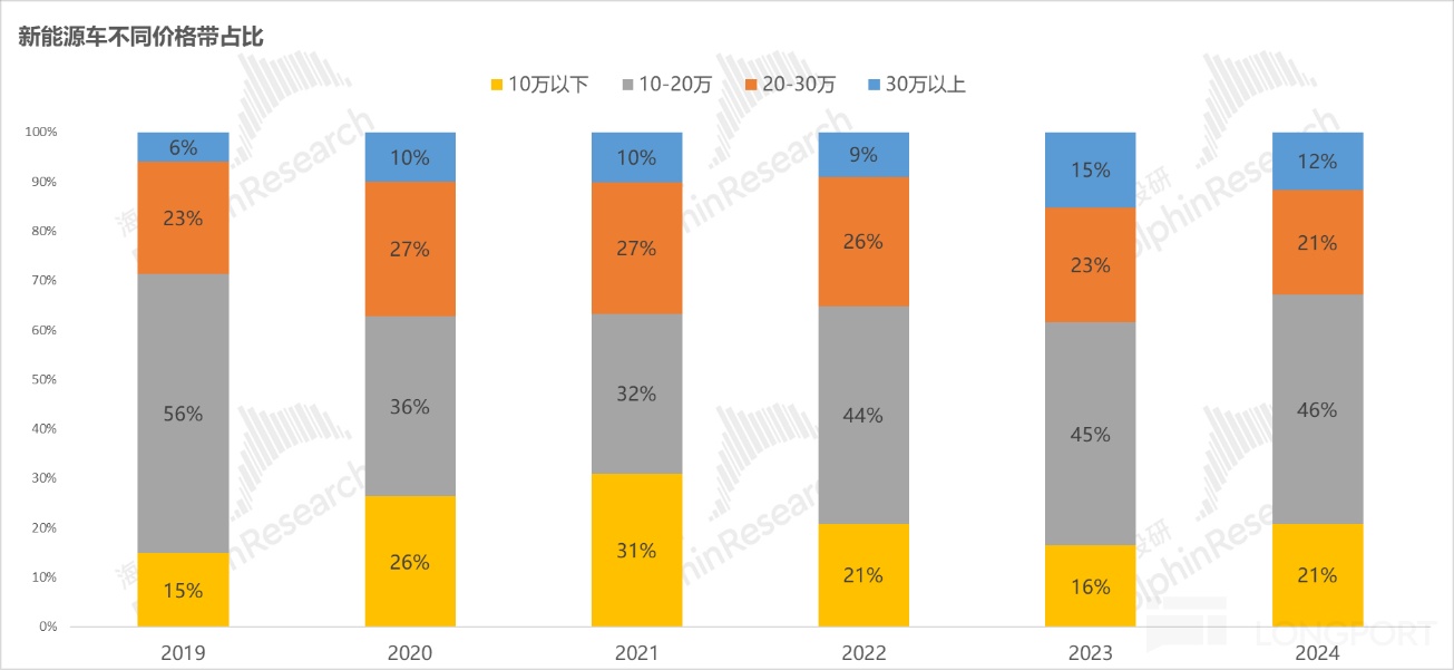 从新能源车在不同价格带的占比作为观测,当行业从供给驱动切换到需求驱动时(2021年 VS 2024年),20万以上的新能源车占比反而呈现了下滑趋势,而10-20万元的新能源车成为了绝对主流,占比持续在提升,几乎快占到了整个新能源车市场的“半壁江山”。
