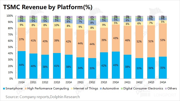 这也是最后呈现的,芯片赛道在HPC和智能手机领域对于高性能芯片的持续的高需求(比如在台湾行的饭局上,传黄仁勋会主动提出台积电涨价的建议),行业结构在往需求升级方向走(先进制程占比持续走高,台积电7nm及以下制程出货收入占比达到70%)。而台积电本身的技术壁垒够高,先进制程具有碾压性优势,持续走由供给侧驱动的逻辑。