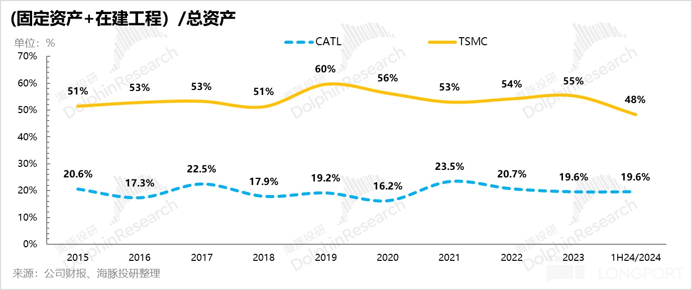 从资产负债表来看,芯片制造行业相比电池制造重资产属性明显更强,台积电固定资产占总资产比例常年维持在50%-60%的范围,而电池制造龙头CATL 固定资产和在建工程占总资产的比例也只在20%上下波动。