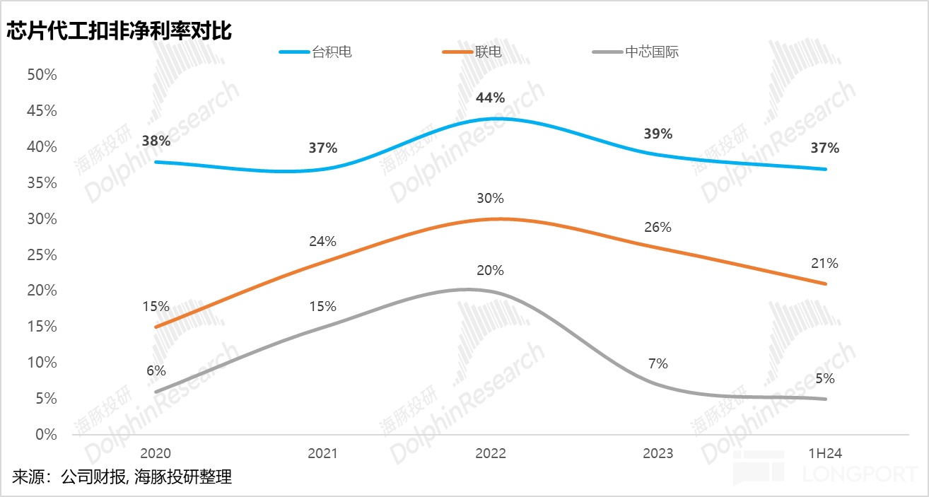 而海豚君之前在对重资产生意中提到,重资产模式属性越高,在终端需求持续高增时,规模效应优势会更加明显,单位折旧摊销变低,利润端会有所释放,相应也会提高ROE水平,而台积电显然更符合这个逻辑。