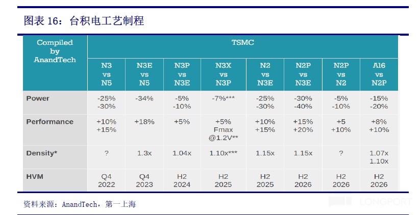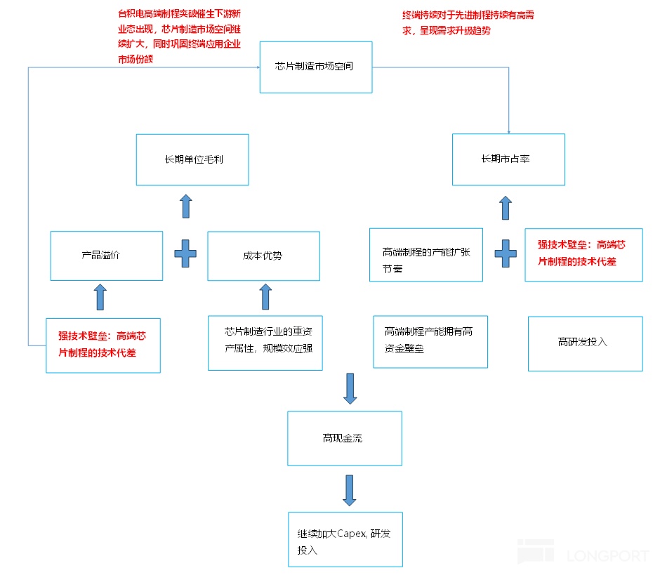 b. 台积电的先进芯片制程是作为上游产业链中影响终端产品(芯片)性能最核心的因素,制程的突破会进一步促进下游产品新业态呈现,扩大终端的整体市场空间,同时巩固终端企业的市场地位;