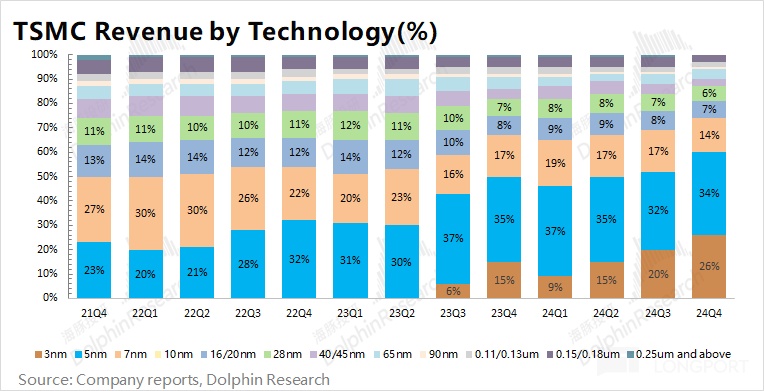 海豚君拿高端制造精密度最高的芯片制造行业的龙头台积电来对比,从研发成果来看: