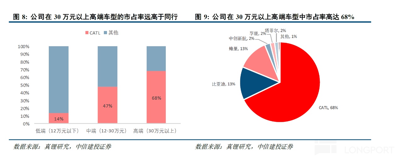 而拆分宁王市占率下滑的原因,可以发现:宁王在能量密度更高,且技术壁垒也相对更高的NCM电池上具有领先优势,虽然NCM电池成本更贵,但高端车型本身具有高溢价去消化更贵的电池成本,所以宁王在国内NCM动力电池市场的市占率持续上行,也因此守住了高端市场的份额(2023年宁王在30万以上高端车型市占率占比达到68%,具有碾压性优势)。