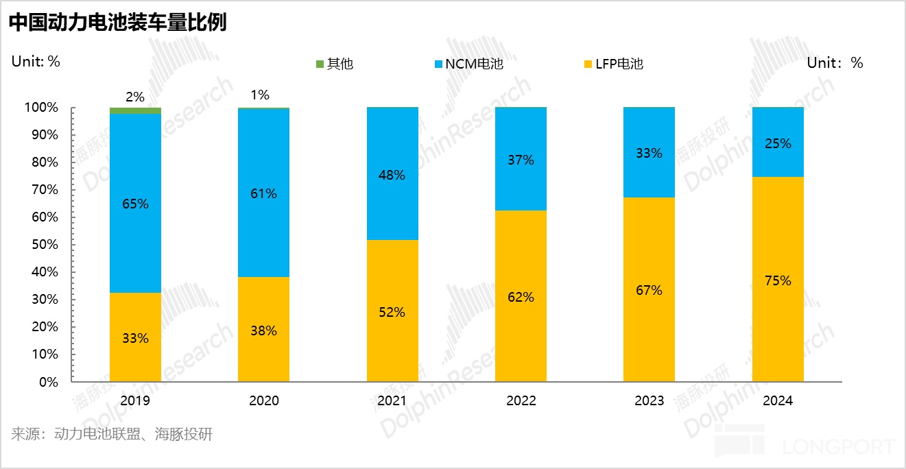 所以新能源汽车行业反而呈现了“需求降级”的趋势:车企会尽可能的压缩电池成本,使电池能量密度低,但同时成本更低的LFP电池的需求占比在持续高增,从2019年33%上升至2024年75%,甚至在2024年12月达到了最高峰,LFP电池装车量占比高达81%。