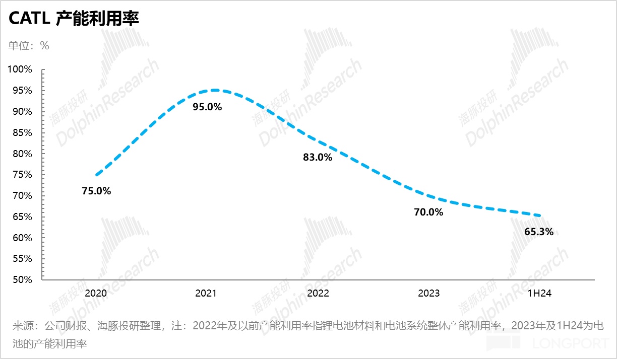 而究其股价回落的根本原因,主要由于电池技术迭代速度不够快,竞争壁垒不高,导致产业快速产能过剩,在2021年年底,宁王的产能利用率上升至最高点95%(同样也是股价的最高点),后持续回落,到2024年上半年宁王的产能利用率已经仅有65%。