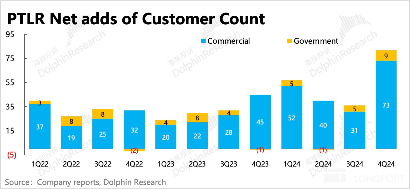 而从最直观的客户数,也偏中长期指标,四季度环比净增 82 家,其中 73 家来自于商业客户,9 家来自政府机构。