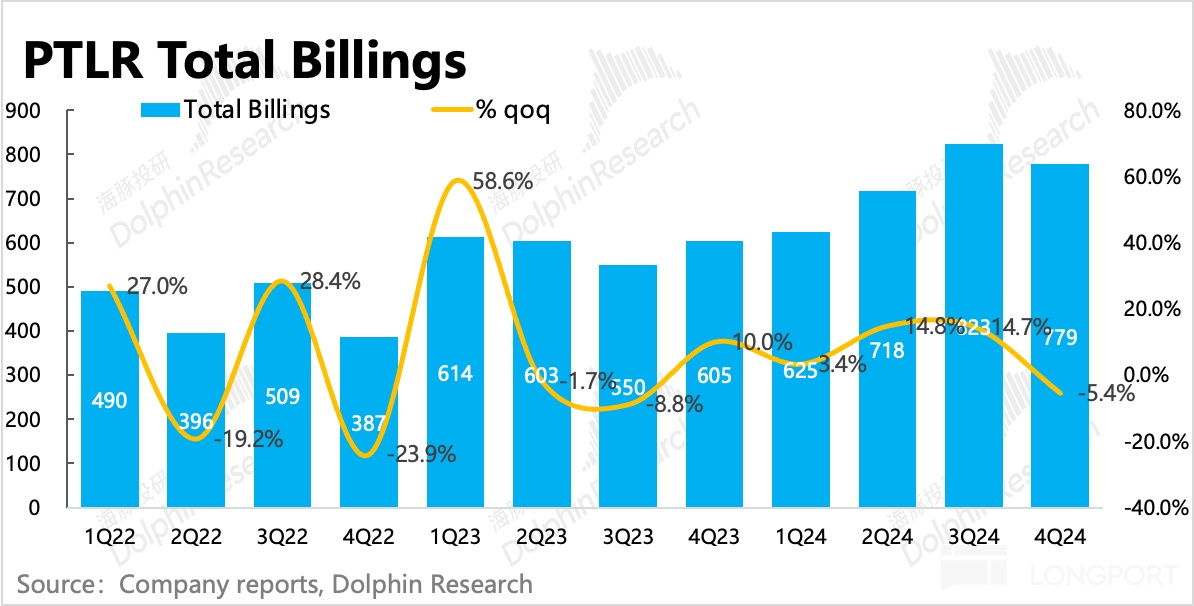 结合<1-4>,海豚君认为,当下客户端对 Palantir 的产品仍然非常感兴趣且合作意愿较高,但可能出于假期扰动或产品变化更迭较快等考虑,短期确定的有效订单增量略微走弱,但并不能说明 Palantir 的产品优势发生了改变。