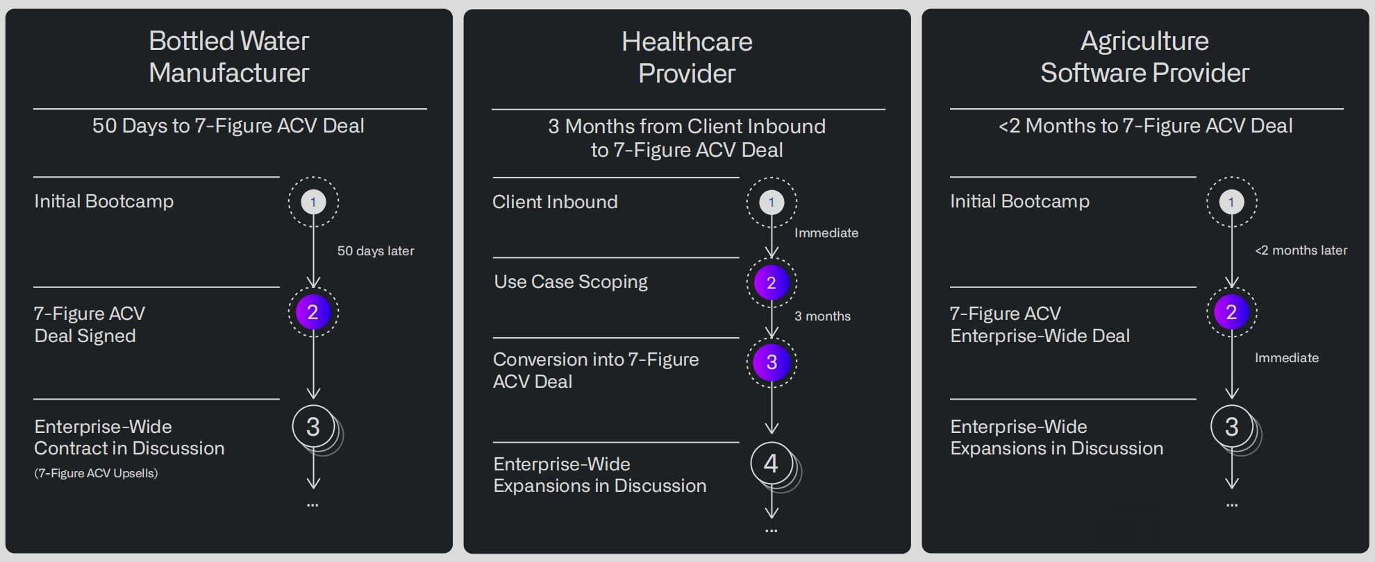 虽然参加 Bootcamp 的企业客户并不一定会真正成为 Palantir 的客户,但 AIP 利用 Bootcamp 策略,成功压缩了整体客户转化时间(压缩至 1-3 个月),一定程度上弥补了 Palantir 的规模化劣势。