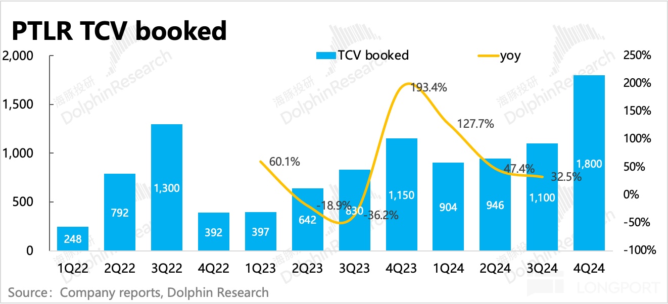 但也因为这个原因,如果要反映 Palantir 真正的业务增长情况,市场更关注与新增合同相关的指标,比如 TCV(合同总价值)、RPO(剩余不可撤销合同额)、客户数量(主要是商业客户)、Billings(当期账单流水)。