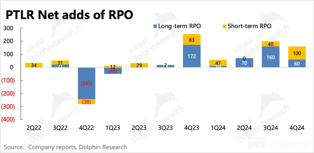 (1)前三者(TCV、RPO、客户数量)涉及到合作周期不同对收入变动影响的问题,因此对中长期做增长展望更有帮助:四季度 RPO 在高基数下仍然维持了 40% 增长。但长短期合同细分来看,一年以上的中长期合同净增量相比 Q3 有明显放缓,需要继续关注一下,看看是否只是假日季的影响。