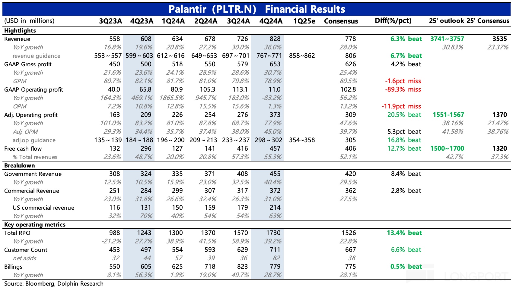 Palantir 主要是向客户提供定制化的软件服务,因此收入在短期内可预期性较强,公司的指引区间也比较窄,隐含收入的确定性较高。但连续多个季度超出指引上限,还是体现出了客户对 AIP 和 Foundry 的旺盛需求。