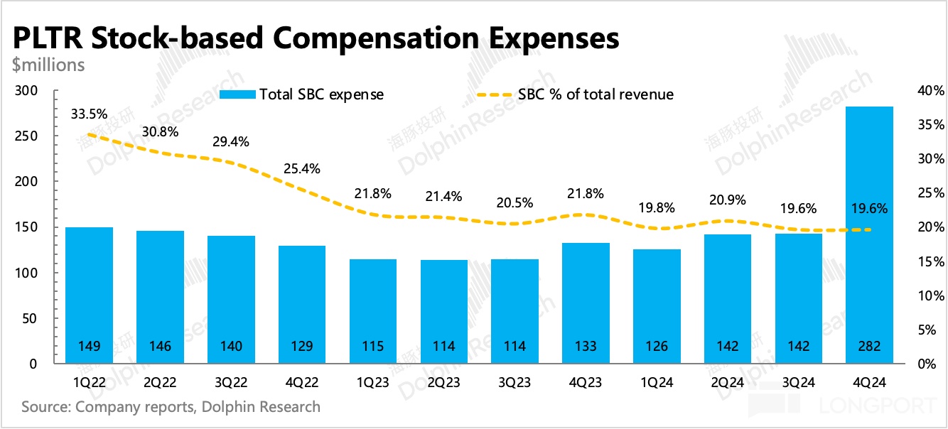 4. 费用扩张有度:上季度海豚君预判 Palantir 要开始提费用和投入了,四季度虽然提了一些,但整体可控,尤其是相较收入扩张幅度。GAAP 下的费用增长主要源于员工股权激励 SBC,但这里面有市值翻了一倍的因素在,实际从期权授予量的增长上来看,人力规模应该是只是适度扩张。