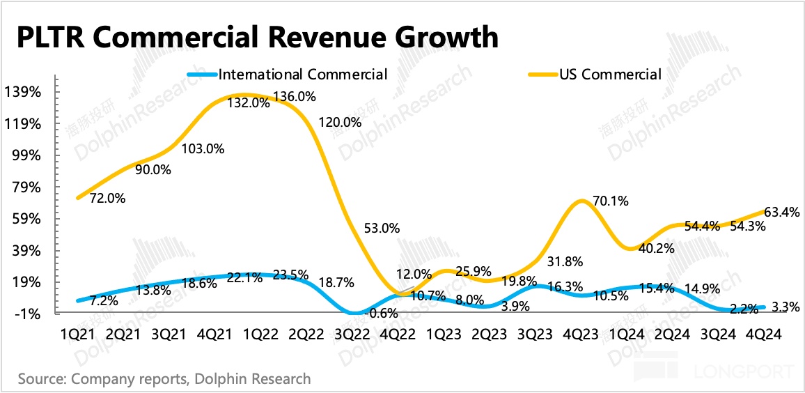 (2)商业市场仍然靠 AI 带动:四季度商业收入同比增速 31%,较二季度有所下滑,主要受国际市场拖累。商业收入的增量主要来源于 AIP 带来的客户需求。