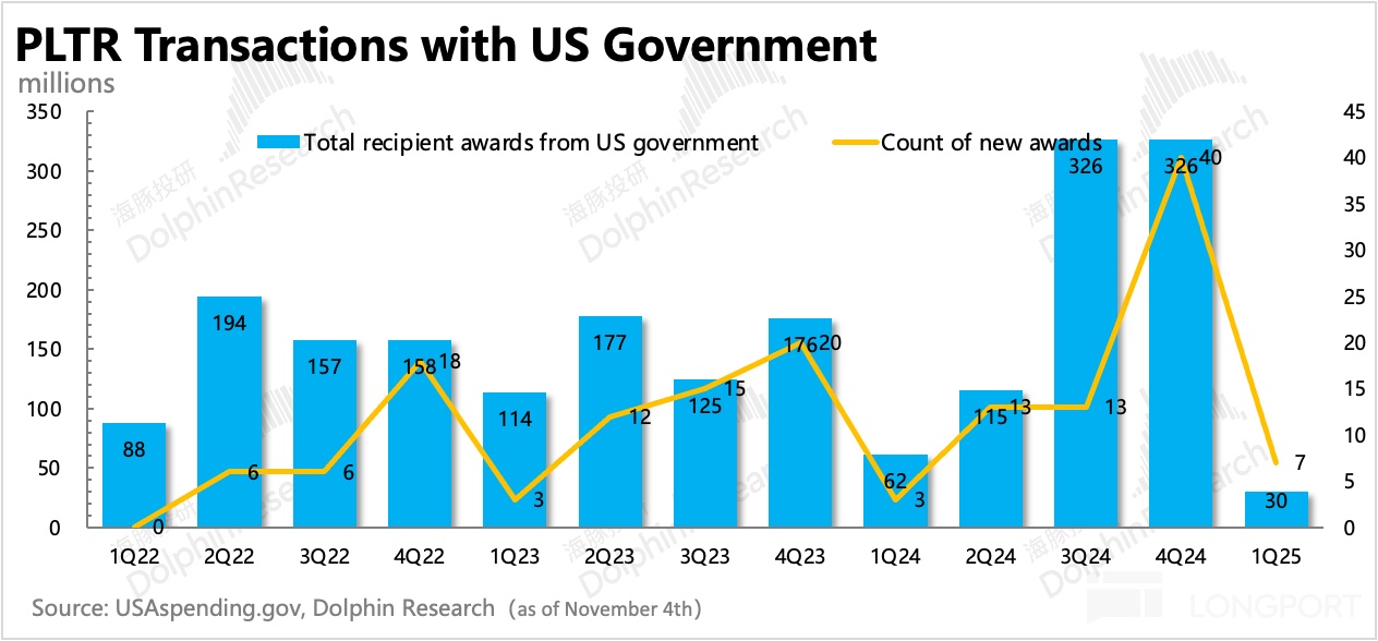 有了特朗普政府和诸多大佬站台的助攻,Palantir 与政府,尤其是国防部的关系网更牢固了,具体体现就是 Q4 斩获了更多的中长期订单以及存量订单追加合作期。