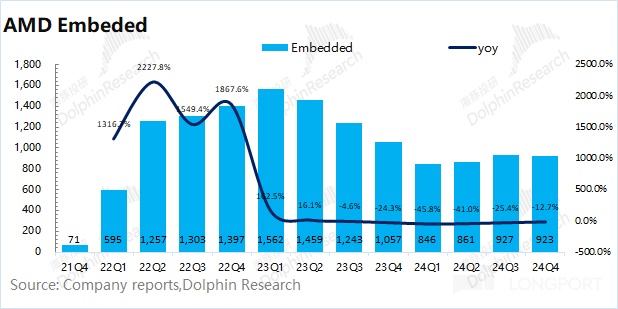 AMD 的嵌入式业务在 2024 年第四季度实现收入 9.23 亿美元,同比下滑 12.7%,略低于市场预期(9.59 亿美元)。公司的嵌入式业务以此前收购的 Xilinx 为主,终端整体需求仍显低迷。但公司扩展了自适应计算产品组合,支撑住嵌入式业务的营收表现。