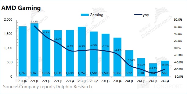 AMD 的游戏业务在 2024 年第四季度实现收入 5.63 亿美元,同比下滑 58.3%,好于市场预期(4.87 亿美元)。半定制销售因微软和索尼减少渠道库存而下降,预计 2025 年恢复正常。游戏显卡业务为推出下一代产品加速清库存,RDNA 4 架构产品将提升性能。
