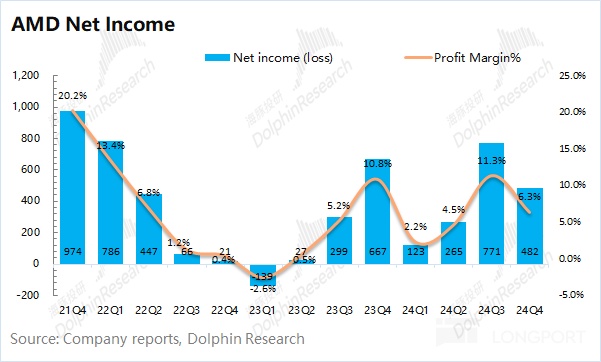 AMD 在 2024 年第四季度实现净利润 4.82 亿美元,本季度净利率 6.3%,再次回落。