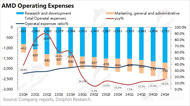 AMD 在 2024 年第四季度的经营费用为 25.04 亿美元,同比增长 16.2%。经营费用端环比继续增加,由于涨幅低于收入增速,经营费用率继续回落。在本季度中,经营费用端还新增了 1.86 亿美元的重组相关费用。