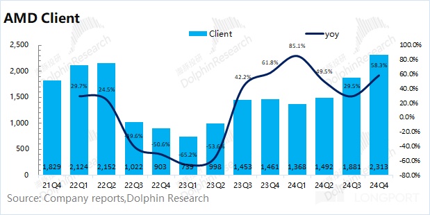 AMD 的客户端业务在 2024 年第四季度实现收入 23.13 亿美元,同比增长 58.3%,是本季度明显好于市场预期(19.86 亿美元)的一项。客户端的增长,主要得益于第五代锐龙 CPU 销量的增长。