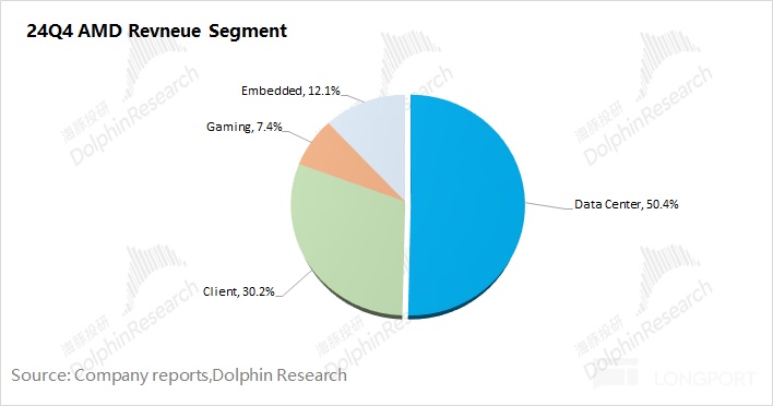 结合行业数据看,2024 年第四季度全球 PC 出货量 6930 万台,同比增长 3.4%。与此同时,AMD 的客户端业务却能取得近 58.3% 的同比增长。相比来看,英特尔的客户端业务同比下滑 9.4%。在整体市场小幅增长的情况下,海豚君认为 AMD 本季度在 PC 市场中取得了更大的市场份额。
