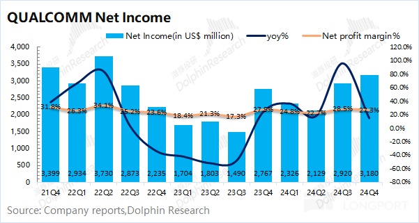 高通在 2025 财年第一季度(即 24Q4)实现净利润 31.8 亿美元,同比增长 14.9%,好于市场预期(30.43 亿美元)。本季度净利率 27.3%,盈利能力略有回落。